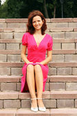 Portrait of happy pretty young woman with long dark hair resting on bench outdoors on spring sunny day.
