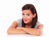 Uroczy kobieta patrzy na Ciebie z rękami skrzyżowanymi