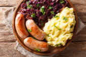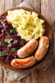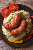 Grillowane kiełbaski z tłuczonymi ziemniakami widok, rustykalny styl z góry