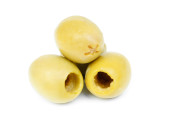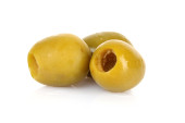 Niektóre zielone pestki oliwek na białym tle na białym tle