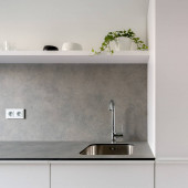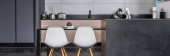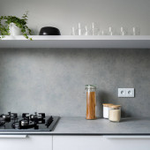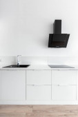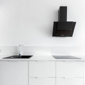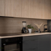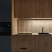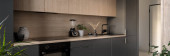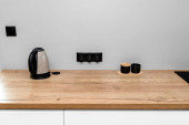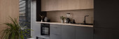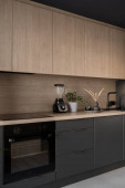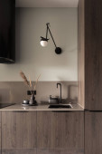 Close-up on wooden kitchen countertop with black sink and tap and decorations