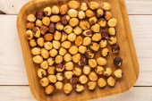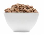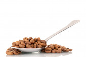Several fragrant freshly roasted coffee beans with a metal spoon, close-up, isolated on white.