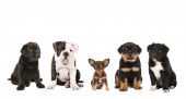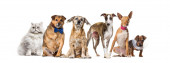 Grupa chorych, niewidomych, rannych, niepełnosprawnych psów i kotów stojących w rzędzie, izolowane na białym