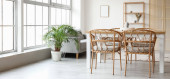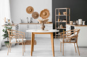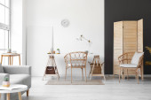 Interior of cozy living room with rattan table, armchairs and shelving unit