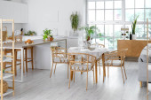 Zdjęcie "Interior of cozy living room with rattan table, armchairs and shelving unit" może być wykorzystywane do celów osobistych i komercyjnych zgodnie z warunkami zakupionej licencji Royalty-free. Obraz jest dostępny do pobrania w jakości wysokiej rozdzielczości do 5760x3840.