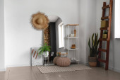 Interior of cozy living room with rattan poufs, armchair and sofa