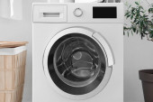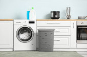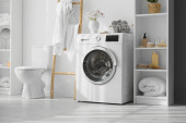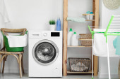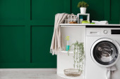Zdjęcie "Shelving unit with bath supplies and washing machine in laundry room" może być wykorzystywane do celów osobistych i komercyjnych zgodnie z warunkami zakupionej licencji Royalty-free. Obraz jest dostępny do pobrania w jakości wysokiej rozdzielczości do 5760x3840.