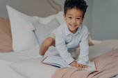 Zdjęcie "Cute zdjęcie małego afro amerykańskiego uśmiechniętego dziecka w jasnoniebieskiej koszuli siedzi na łóżku rodziców z książki opowiadania wcześnie rano w weekend. szczęśliwy chłopiec dzieciak spędzając wolny czas w domu koncepcja" może być wykorzystywane do celów osobistych i komercyjnych zgodnie z warunkami zakupionej licencji Royalty-free. Obraz jest dostępny do pobrania w jakości wysokiej rozdzielczości do 5760x3840.