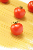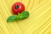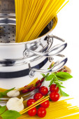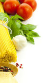 Włoska gotowanie /spaghetti z pomidorami i bazylią / na tle