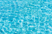 Tło błękitnej wody w basenie z odbiciem słońca, falą wodną w basenie. Przezroczyste tło wody
