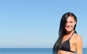 dziewczyna w niebieskim tunika jest korzystających lato na plaży