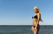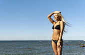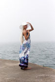 blondynka w żółte tuniki znajduje się w pobliżu morza na kolanach