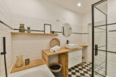 Zdjęcie "Toaleta ścienna i mały zlewozmywak w rogu w toalecie z beżową płytką" może być wykorzystywane do celów osobistych i komercyjnych zgodnie z warunkami zakupionej licencji Royalty-free. Obraz jest dostępny do pobrania w jakości wysokiej rozdzielczości do 5760x3840.