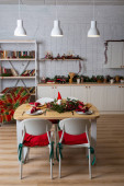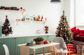 Olive Provencal Kitchen with Christmas Decor. Kitchen Interior with Red Christmas Toys. Copy Space
