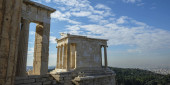 Malowniczy widok na Akropol w Atenach, Grecja z lasami w tle