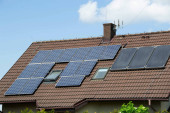 Dach domu z modułami fotowoltaicznymi. Historyczny dom rustykalny z nowoczesnymi panelami słonecznymi na dachu i ścianie