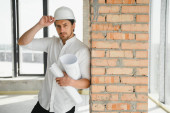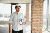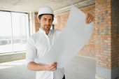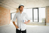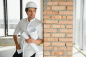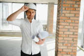 Portrait of man architect at building site. Confident construction manager wearing hardhat. Successful mature civil engineer at construction site with copy space