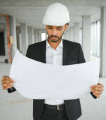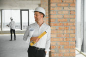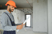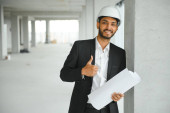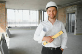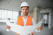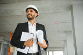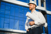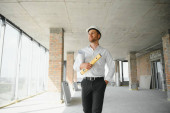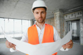 Portrait of man architect at building site. Confident construction manager wearing hardhat. Successful mature civil engineer at construction site with copy space