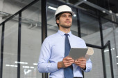 Zdjęcie "Portrait of man architect at building site. Confident construction manager wearing hardhat. Successful mature civil engineer at construction site with copy space" może być wykorzystywane do celów osobistych i komercyjnych zgodnie z warunkami zakupionej licencji Royalty-free. Obraz jest dostępny do pobrania w jakości wysokiej rozdzielczości do 5760x3840.