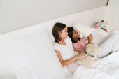 Asian girl playing with her kitten while sitting on bed at home