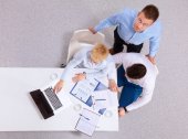 Biznesmeni siedzący i dyskutujący na spotkaniu biznesowym, w biurze