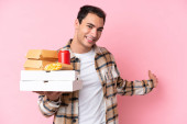 Young caucasian man holding fast food isolated on pink background extending hands to the side for inviting to come