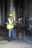 Pracownik w czasie mycia nacisk twardy kapelusz