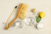 Pump bottle and cleaning supplies on white background