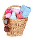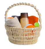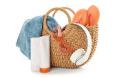 Wicker basket with different cleaning supplies and spray bottle on white background