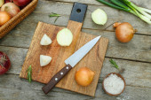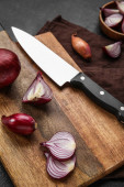 Wooden board with red onion on dark background, closeup
