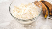 Składniki w szklanych misek do pieczenia ciasta czekoladowego z polewą czekoladową.