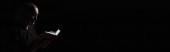 boczny portret księdza w zakapturzonej sutannie odizolowany na czarno, baner