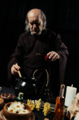 Zdjęcie "alchemik w kolbie utrzymującej płaszcz z płynem w pobliżu garnka i suszonymi ziołami izolowanymi na czarno" może być wykorzystywane do celów osobistych i komercyjnych zgodnie z warunkami zakupionej licencji Royalty-free. Obraz jest dostępny do pobrania w jakości wysokiej rozdzielczości do 5760x3840.