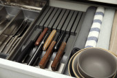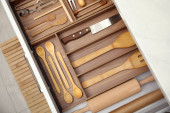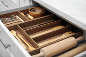Zdjęcie "Open drawer of kitchen cabinet with different utensils, closeup" może być wykorzystywane do celów osobistych i komercyjnych zgodnie z warunkami zakupionej licencji Royalty-free. Obraz jest dostępny do pobrania w jakości wysokiej rozdzielczości do 5760x3840.