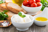 pyszne mozzarelli i składniki na sałatkę na drewnianym stole