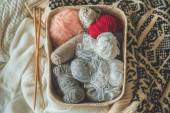 Balls of wool yarn, knitted little hat and wooden knitting needles on wooden background. Hobby craft. Concept of knitting, needlework.