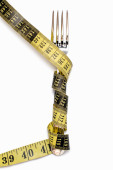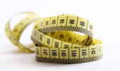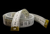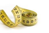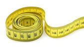 Yellow measuring tape twisted on a white background. Tool for measuring length and volume. Yellow and black twisted tape for measuring in the sewing industry and the human body