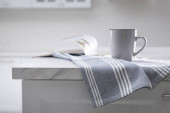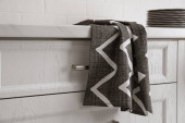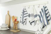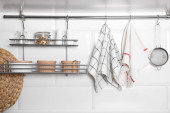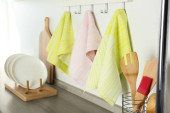Zdjęcie "Different clean towels hanging on rack in kitchen" może być wykorzystywane do celów osobistych i komercyjnych zgodnie z warunkami zakupionej licencji Royalty-free. Obraz jest dostępny do pobrania w jakości wysokiej rozdzielczości do 5760x3840.