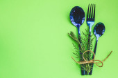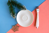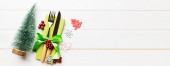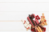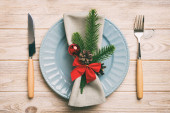 Stolik świąteczny nakrycie świątecznym wystrojem i talerze, kine, widelec i łyżka. Świąteczne tło. Widok z góry z miejsca kopiowania.