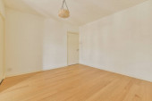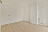 Wnętrze pustego białego pokoju z dużymi oknami balkonowymi z zasłonami i drewnianą parkietową podłogą