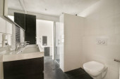 Wnętrze nowoczesnej łazienki z prysznicem i marmurowymi ścianami w minimalnym stylu