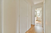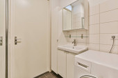 Wnętrze nowoczesnej łazienki z prysznicem i marmurowymi ścianami w minimalnym stylu