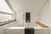 Zdjęcie "Wnętrze nowoczesnej łazienki z prysznicem i marmurowymi ścianami w minimalnym stylu" może być wykorzystywane do celów osobistych i komercyjnych zgodnie z warunkami zakupionej licencji Royalty-free. Obraz jest dostępny do pobrania w jakości wysokiej rozdzielczości do 5760x3840.