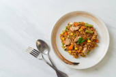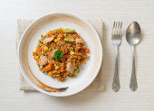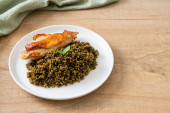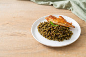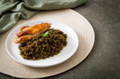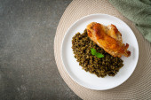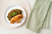 pesto smażony ryż z grillowanym kurczakiem na białym talerzu