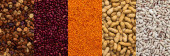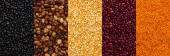 Different types of legumes banner, yellow peas and lentils and mung beans, red and brown beans, top view