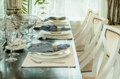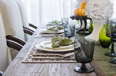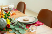 Cozy table setting with fall decor, flowers and utensils in dining room. Bouquet of fall flowers. Cozy kitchen interior. Festive table with wicker napkins, white plates and cutlery on wooden table.