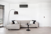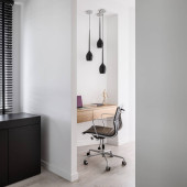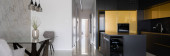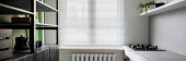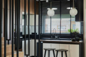 Modern kitchen interior with black ceiling, wooden furniture and big window with black blinds
