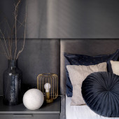 Stylish bedroom with cozy bed with nice bedclothes and pillows, big mirror and decorations
