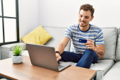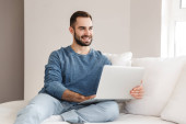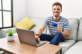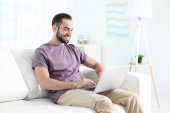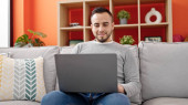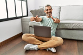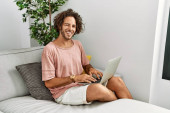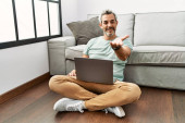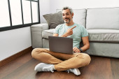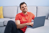 Młody Hiszpan korzystający z laptopa siedzącego na podłodze w domu