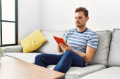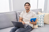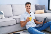 Zdjęcie "Młody Hiszpan korzystający z laptopa siedzącego na podłodze w domu" może być wykorzystywane do celów osobistych i komercyjnych zgodnie z warunkami zakupionej licencji Royalty-free. Obraz jest dostępny do pobrania w jakości wysokiej rozdzielczości do 5760x3840.